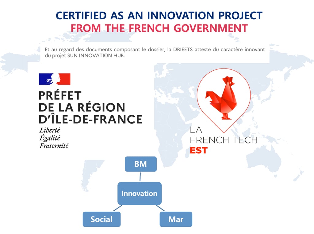 Trước đó tại Pháp: SUN INNOVATION HUB đã nhận chứng nhận "Dự án Startup Đổi Mới Sáng Tạo" từ chính phủ Pháp.